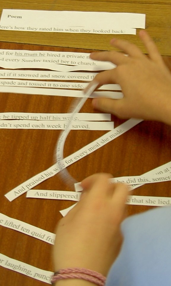 The lesson starts with a sequencing exercise – a classic ‘DARTs’ activity. Rather than reading the poem intact, pairs of students are given the lines cut-up, to sequence. There are even ‘blanks’ to go between stanzas.