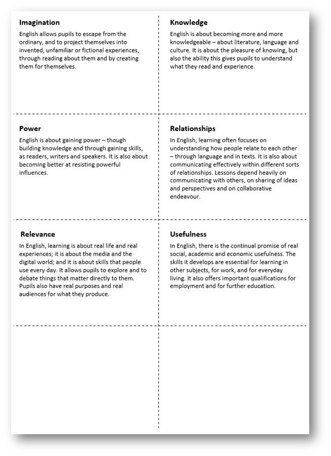 As a starting point, I suggest that teachers reflect on the five ‘models’ of English identified in the 1989 Cox Report, which informed the first National Curriculum for English: ‘personal growth’; ‘cross-curricular’; ‘adult needs’; ‘cultural heritage’; and ‘cultural analysis’. This might seem like going back a long way, but I think it’s still useful. Of course, as Cox stressed, these views of English “are not sharply distinguishable, and they are certainly not mutually exclusive.” (Cox, 1989, p. 60)