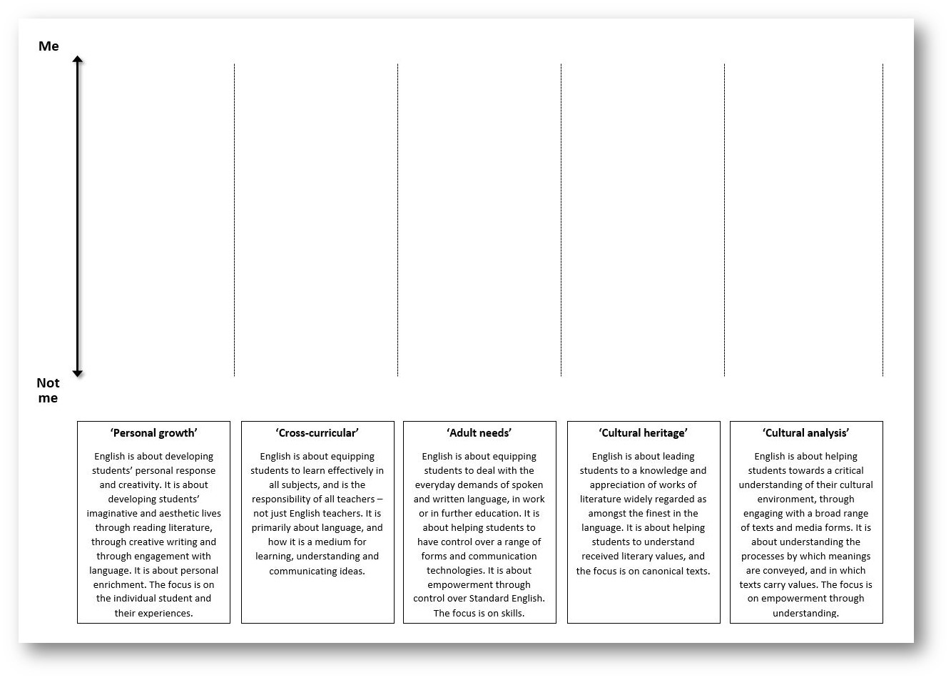 It is interesting how this exercise can uncover significant differences in philosophy between teachers in a department or team, although it will also confirm areas of commonality. Most importantly, it tends to show the need for an ongoing conversation about the why of English, as well as the how. It is easy for ‘purpose’ to become taken for granted.