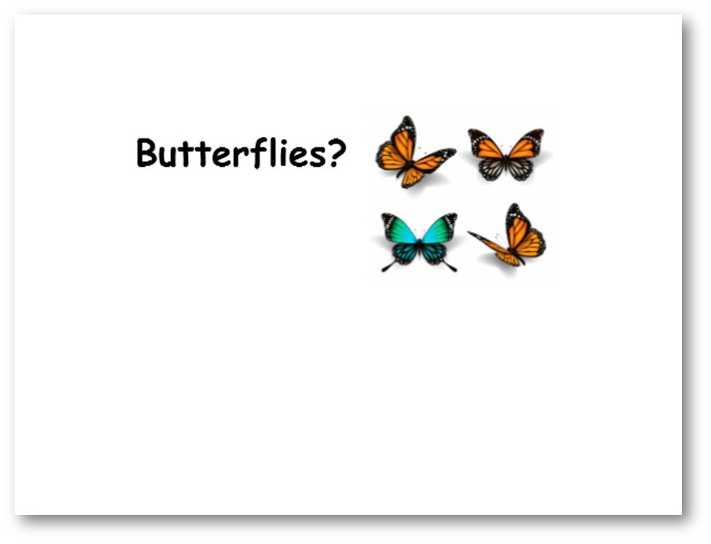 Formally starting the lesson, we thought of some “things about butterflies” which were written on the board. At this point, there was no discussion – just a rapid fielding of ideas.