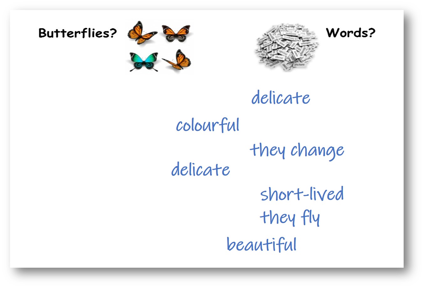 Words can fly. What do you mean? They go from people’s mouths across to other people. That doesn’t sound like how a butterfly moves – it sounds too straight-liney – too direct. Sometimes we hear words floating across from somewhere. Ah, okay. Is that like a butterfly, though? Yes! They flutter about a room. OK. Have you heard the expression “Words flew”? Yes. What do you think that means…? And so on.