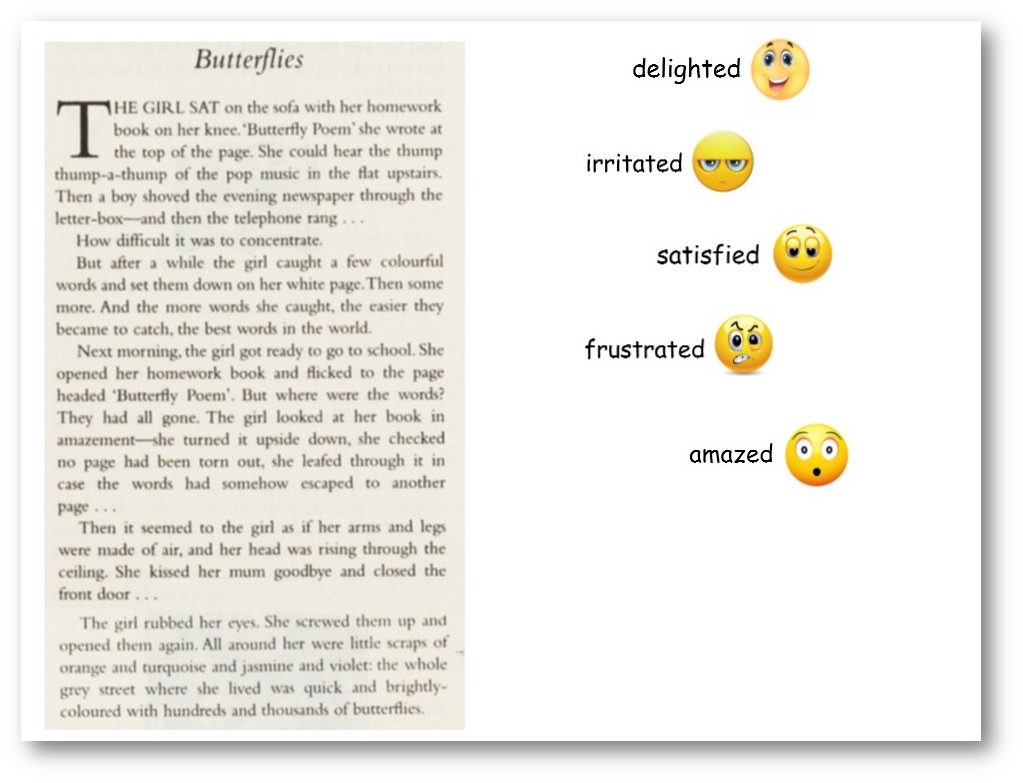A pupil suggested that ‘Frustrated’ could go with the first paragraph. I said that we needed more precision than that – we needed an exact place. Could she pin it to a particular word or phrase.