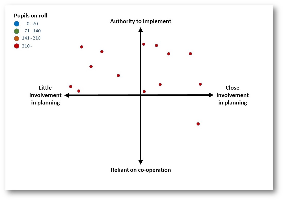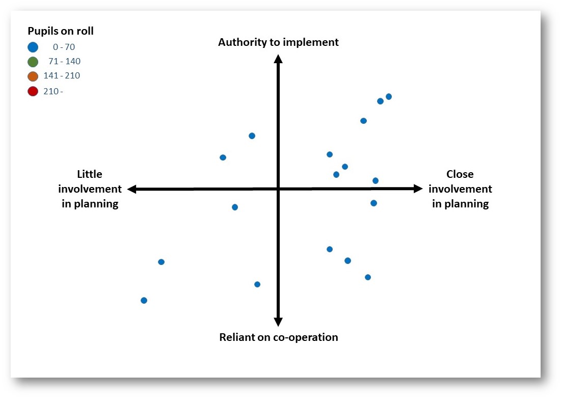 However, there is some predictable difference between schools of different sizes. In the largest schools, subject leaders have more seniority, while still evenly spread in terms of how involved they are with planning.