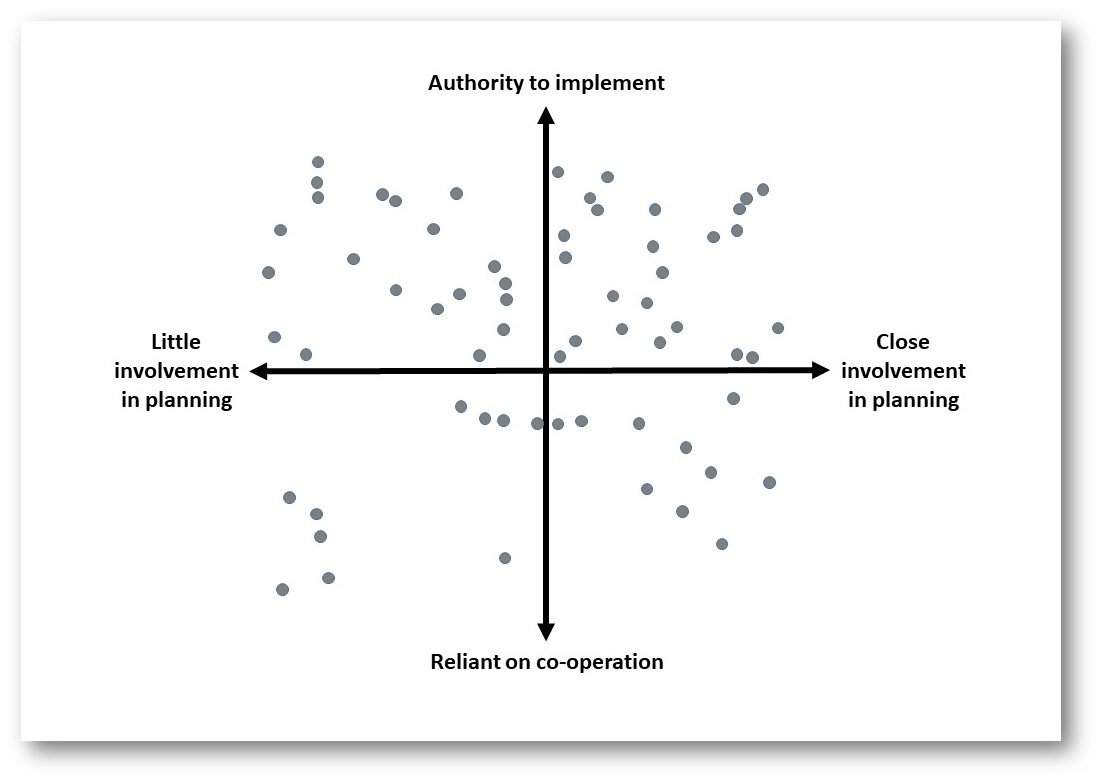 When we asked a number of primary English subject leaders (not selected on any scientific basis) where they saw themselves, there was a fairly even spread from low to high involvement in planning, while there was some general weighting towards having the authority to implement.