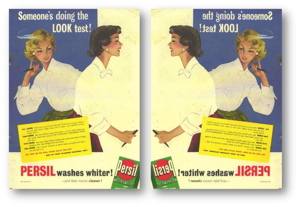 Exploring gender representations in advertising, pupils will note that the 1950s woman using Persil is striding (with her pen) into a confident, cleaner future, watched enviously by a colleague heading into a greyer past (with her pen) – a meaning which is lost when the image is flipped.
