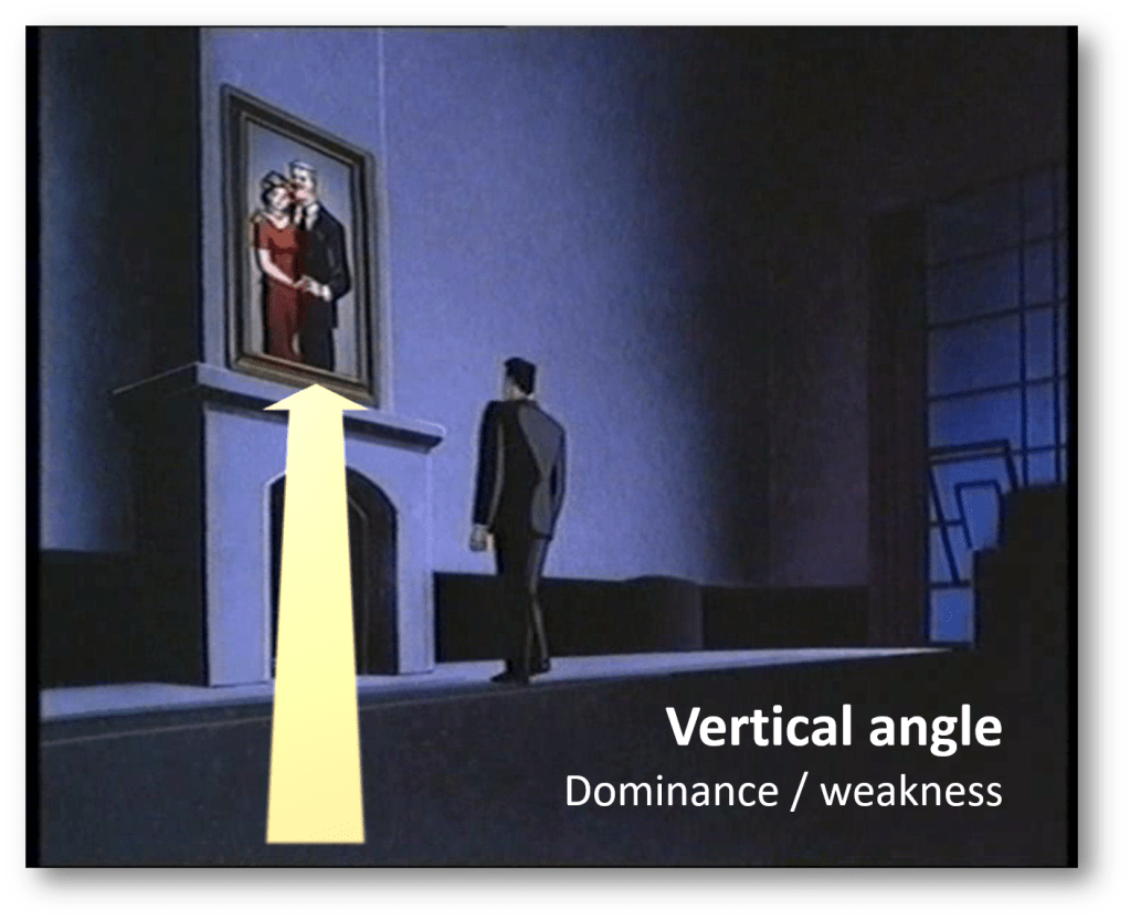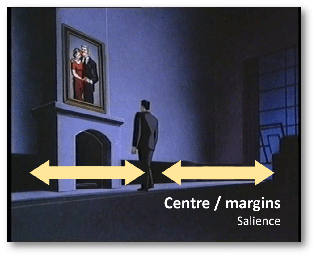 This visual grammar is analogous to verbal grammar in a number of ways, and it can be helpful with pupils to make simple translations of images into sentences. This, for example, could be ‘Wayne’s dead parents loom over him, as he turns his back on the future.’ Flipped, the image could read ‘Turning from the window, Wayne regards his dead parents.’ Subject and object are swapped.