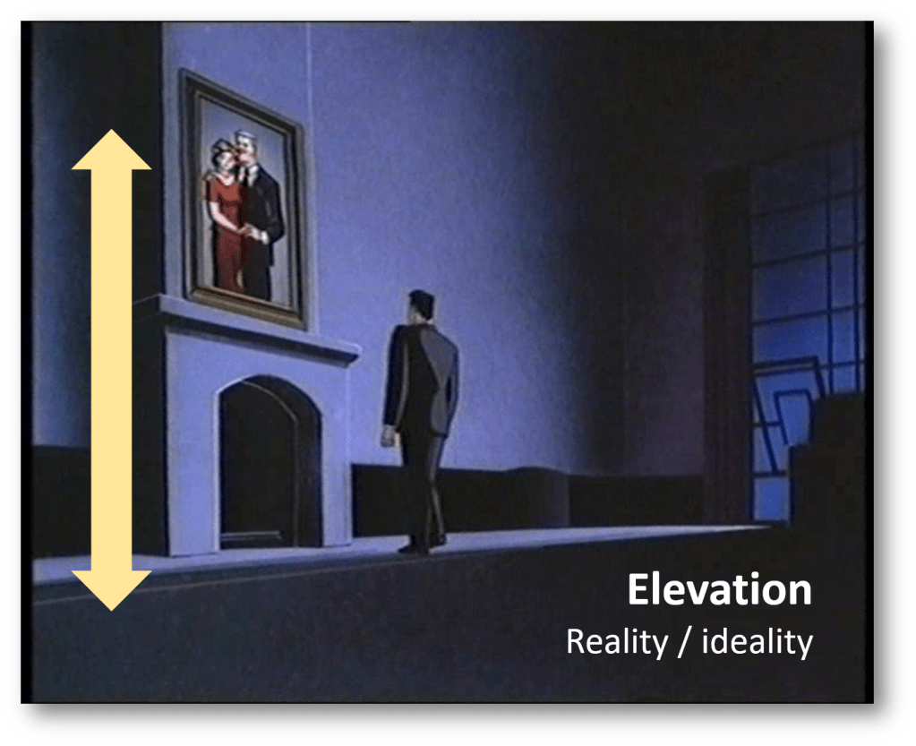 Degree of elevation within the frame can be associated with reality and ideality. Here, the raised up parents are an idea – and they are, of course, idealised – while Wayne remains anchored in reality, a meaning which is reinforced by colour.