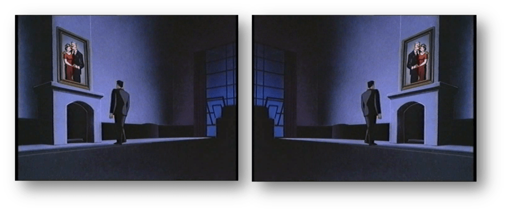 Joe’s piece of writing was on this frame from quite early in the film, in which Wayne has left a party to visit a portrait of his dead parents and to contemplate his possible futures.