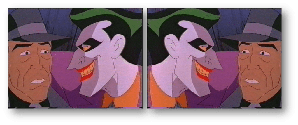 When this image of the character Andrea kicking the Joker is flipped, she does seem to remain the active subject of the visual sentence, partly because of the cropping of the Joker’s form, and the obscuring of his face. However, some of her rootedness and power is lost. While the Joker is still flying helplessly beyond even the margin of the frame, his body seems visually to be invading it, and Andrea seems off-balance and defensive. While the original visual sentence might be ‘Strong Andrea decisively kicks the Joker out of her way’, the flipped image might read ‘Andrea repels the Joker with a desperate kick.’
