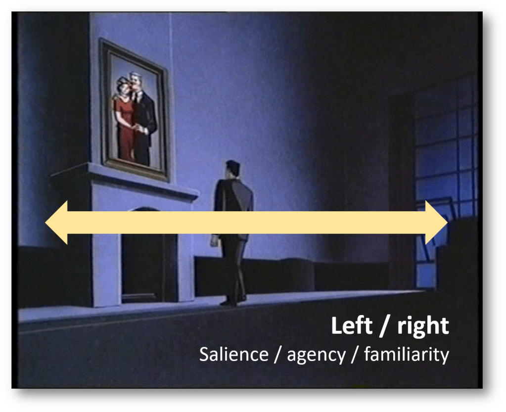 1. It should be mentioned that all of the “flipped” analysis depends on an audience that is literate in a written language that reads left-to-right. It would be interesting to contrast this with stills from anime, or panels from manga, to see how they communicate the same messages.