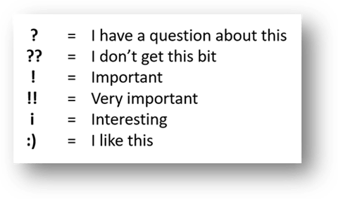 Such annotation might serve its function just by encouraging attentiveness and prompting thinking; or it might well be a starting point for discussion: “Did anyone put a double question mark? Why?” “I see that you’ve put an ‘i’ – what did you think was interesting?” And so on.