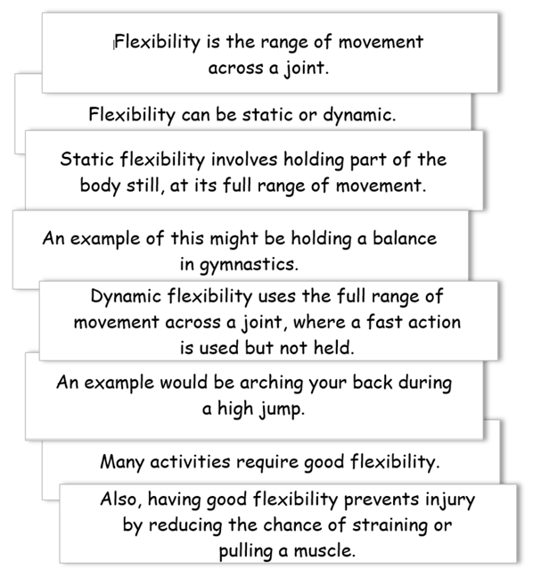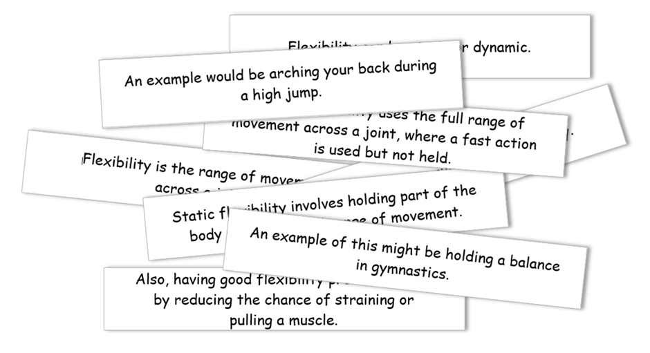 For example, a GCSE PE class might reconstruct an explanation of a key concept such as ‘flexibility’. By the time they have done so, they will have read the parts and the whole closely and will have related these to each other, and they will have to have understood them. Again, this activity is good for encountering new knowledge and for recovering prior learning.