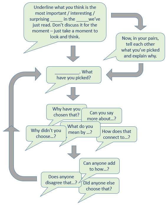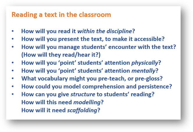 This new post suggests some ways to ensure that students, in any subject, are reading a text ‘actively’. In other words, that they are processing meanings and thinking hard as they read. This is really about the third bullet in the list above (managing students’ ‘encounter’ with a text) and the fifth bullet (pointing students ‘mentally’) but it also crosses into the last bullet (giving structure to their reading.)