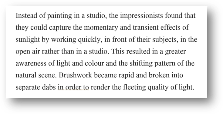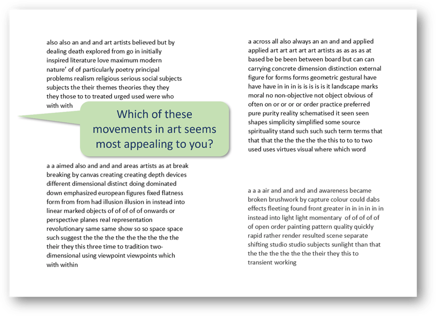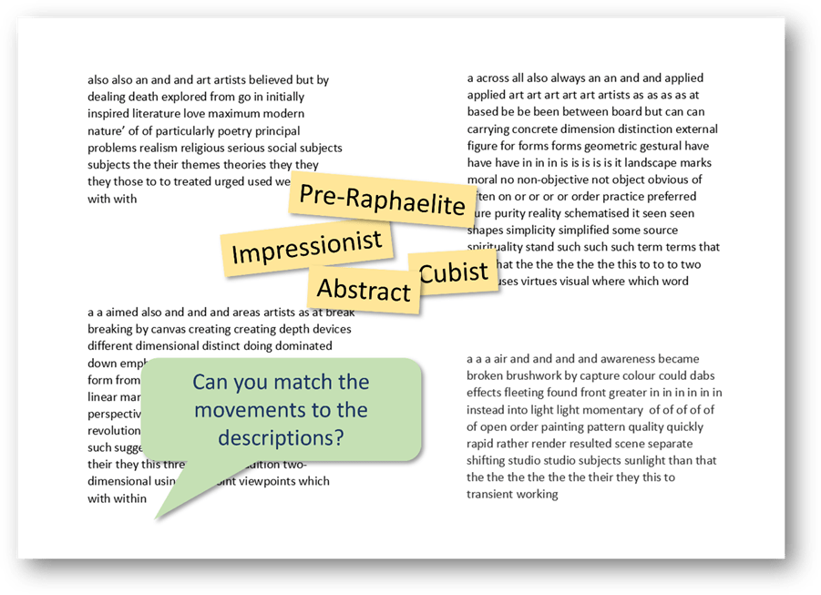 And it can be a way into quite advanced, academic texts. For example, in an art lesson, students might be presented with these four scrambled descriptions of artistic movements, borrowed from the Tate Gallery’s website. A good opener is to ask them which one they find most personally appealing.