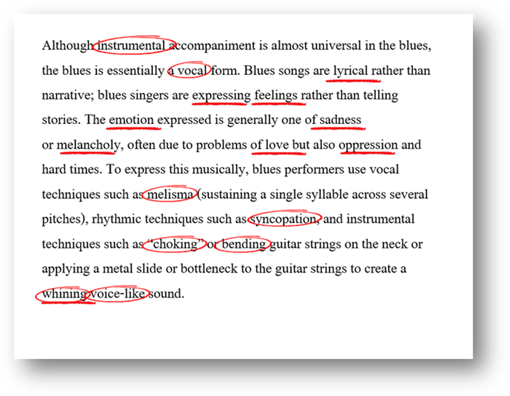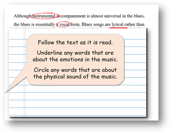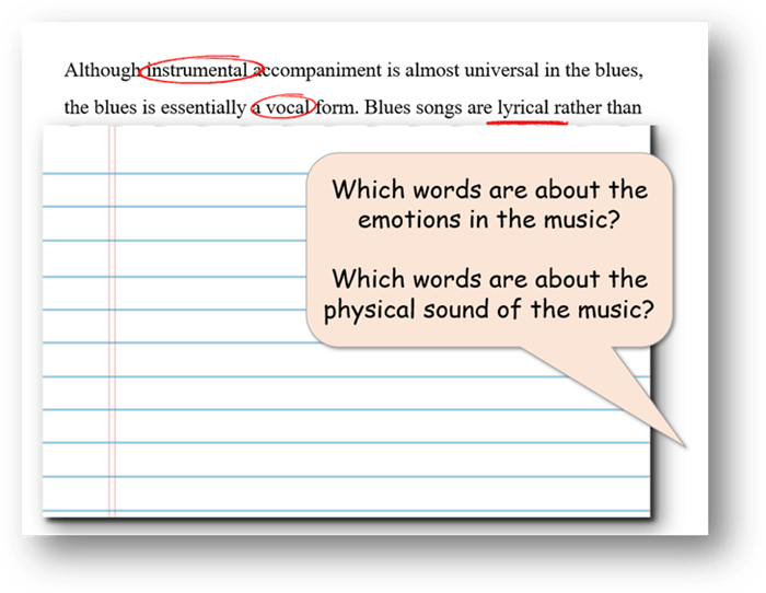 A more prescribed form of annotation is when students are asked to look out for particular things to mark or to highlight – a sort of running treasure hunt for useful or relevant ideas or words. This always works best (like so many things) when it is modelled first. For example, in a lesson on the blues, a music teacher might show the class just the beginning of a shared text – using ‘slow release’ to control their encounter with it – before modelling the annotation of words to do with the physical and the emotional qualities of the music. This is annotation to scaffold ‘reading within the discipline’ – building attentiveness to disciplinary knowledge.
