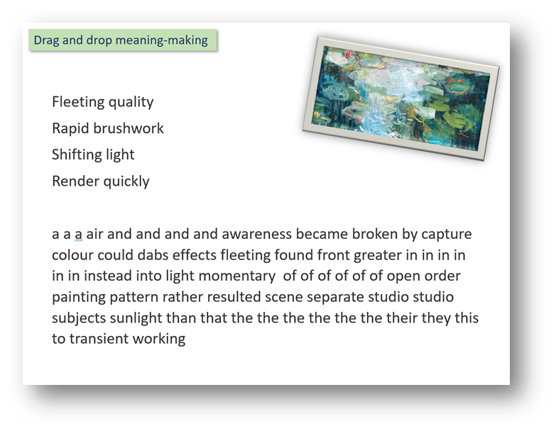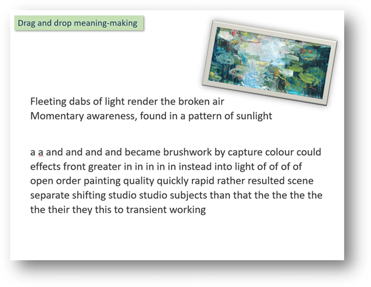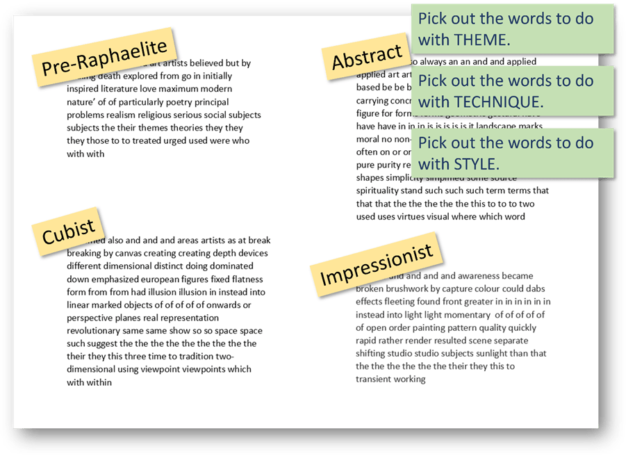 Then they might start to mine the texts for language to do with aspects of art, such as theme, technique or style. All without the distraction of actual sentences…