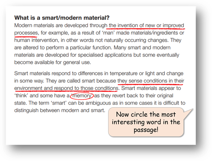 One of my own favourite ways to ‘require’ engagement with a text is to ask students to look out for something they might ‘select’. Importantly, this will be something for which there is no ‘correct’ answer. It might be the “most important” word or phrase, or the “most interesting” sentence, or the most surprising fact, and so on.