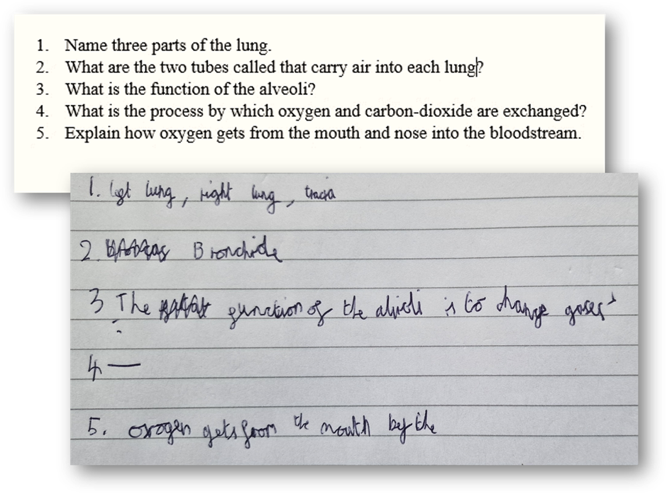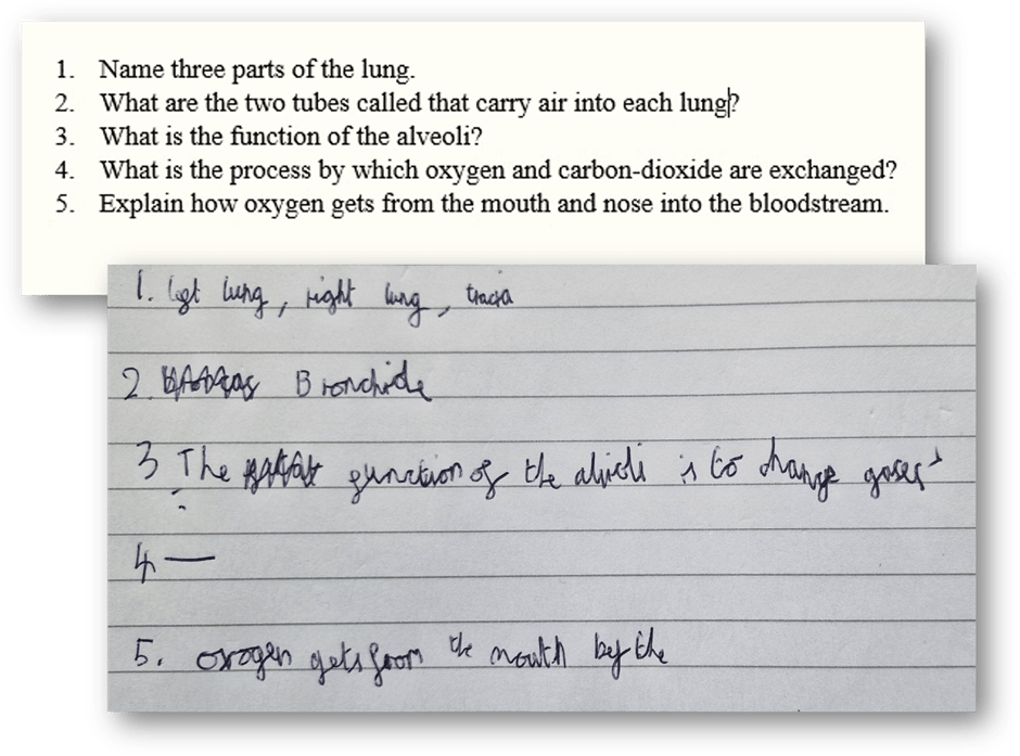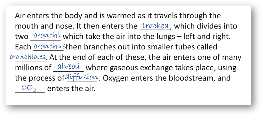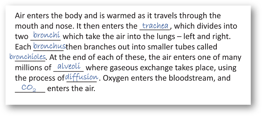 As a starter or ‘Do now’ activity, this might be a useful alternative to just answering questions. Simple to prepare, it brings some reading into the lesson, it can be pacier, and it can avoid the crystallising of misconceptions or gaps that is a hazard of tasks like this:
