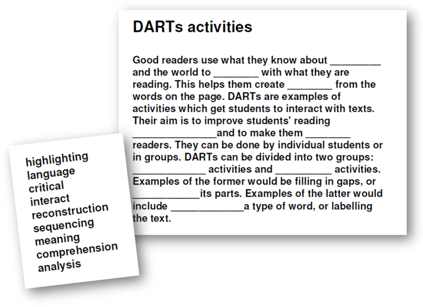 A popular DARTs activity is the ‘cloze’, in which the reader fills gaps in the text. Often derided as unchallenging or busy work, this can actually be a powerful (and engaging) way to require some hard thinking. Try it with this: