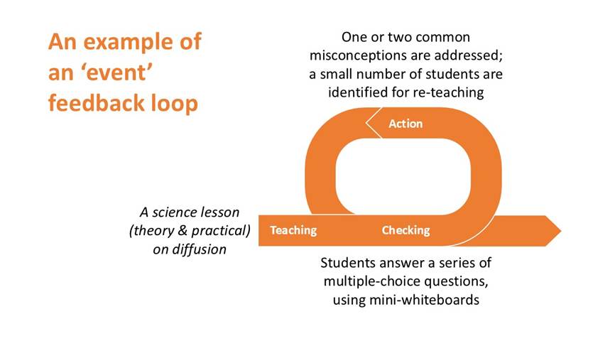 Some feedback loops are ‘events’. These are the visible ‘I am now checking for understanding’ activities, like quizzes, cold-calling, answering questions on mini-whiteboards, short paper-based tasks, multiple-choice questions, and so on. They punctuate lessons, and they are followed by clear teacher actions, such as the addressing of a misconception, the deliberate re-explaining or re-teaching content, the identification of a group who need further breaking down of material or more scaffolding, the revisiting of prior learning, extra modelling, or the injection of new challenge – perhaps by exploring new, tangential or related ideas.