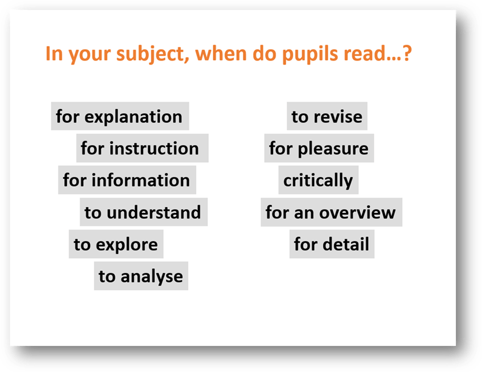 The only teachers who ever say that pupils read for pleasure in their subject are English teachers, and even they tend to see this as synonymous with ‘private’ or ‘independent’ reading.